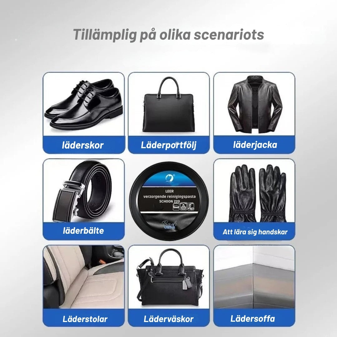 Slitet läder? Inte nödvändigt. Med LäderGlans rengöringskräm ger du dina lädermöbler, väskor eller bilsäten ett nytt liv. En enkel behandling rengör, vårdar och skyddar – så att ditt läder glänser som på första dagen.